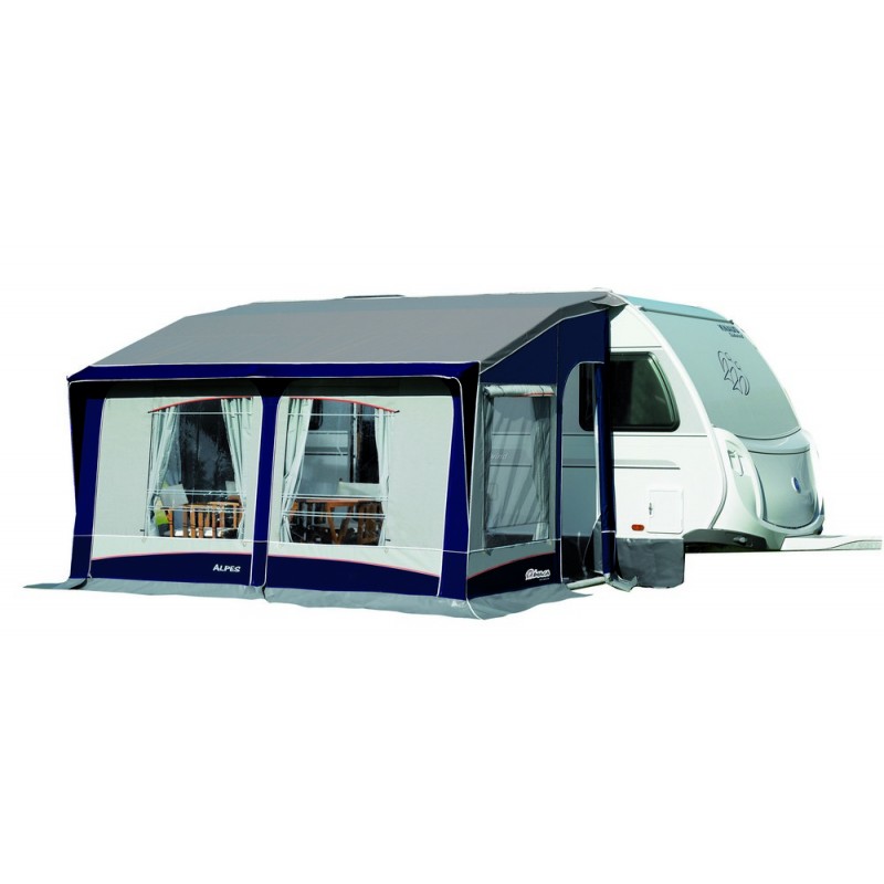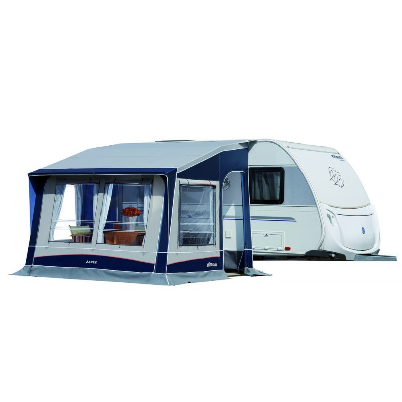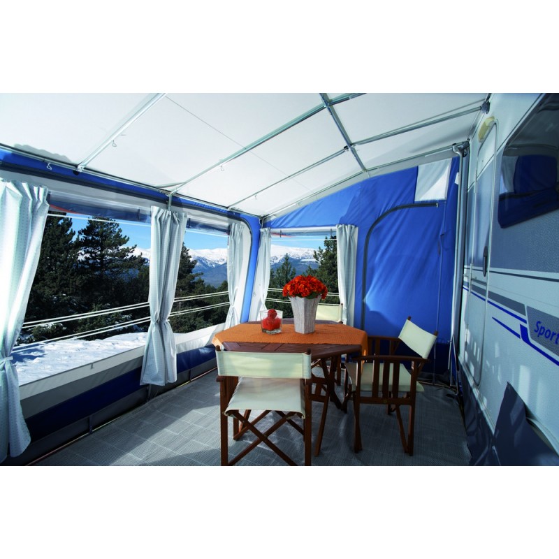 Avancé de techo recto con doble inclinación y estructura reforzada. Muy sólido y de estética espectacular este modelo es universal y adaptable a cualquier caravana ya que los anclajes son ajustables en altura.